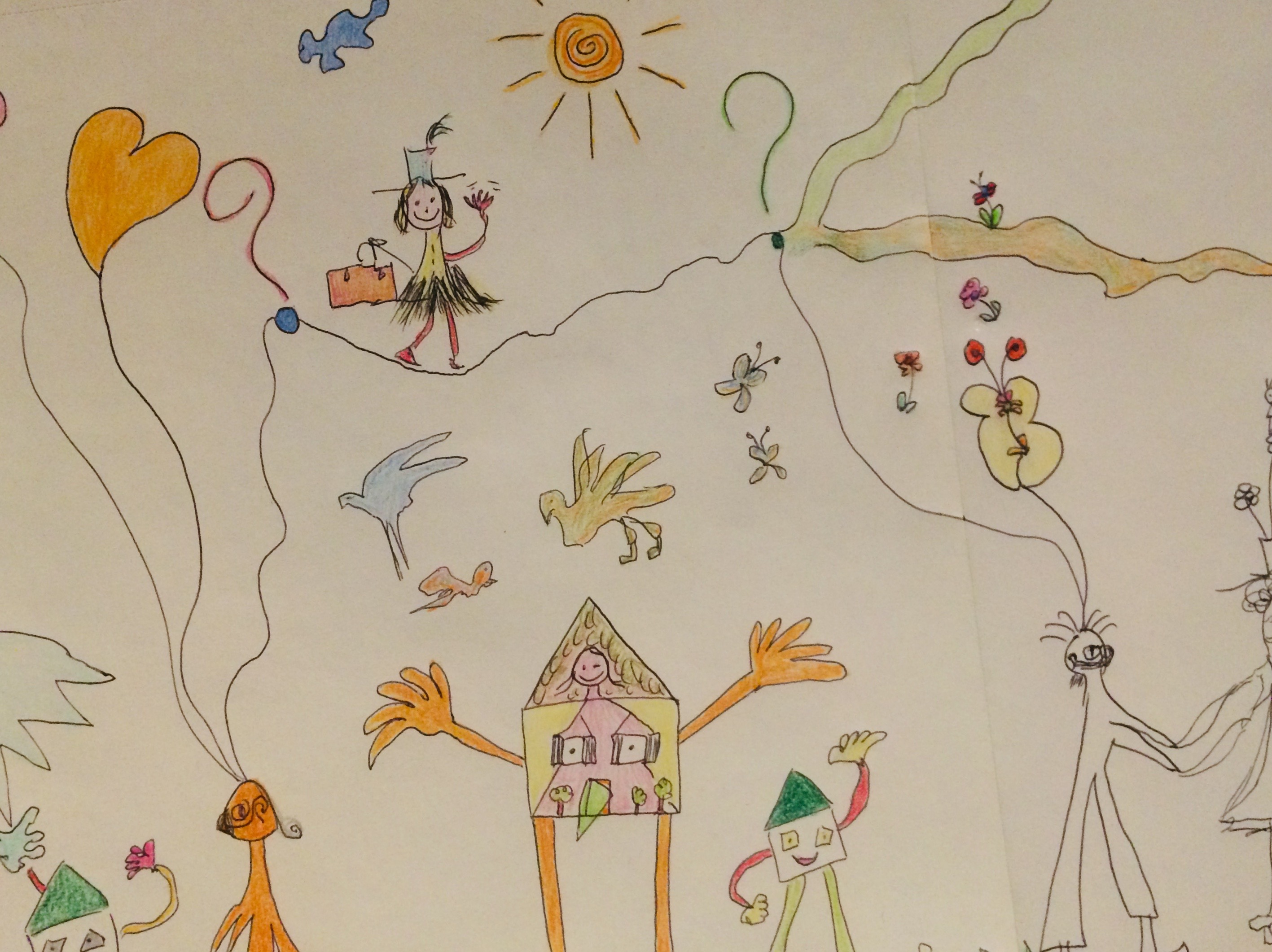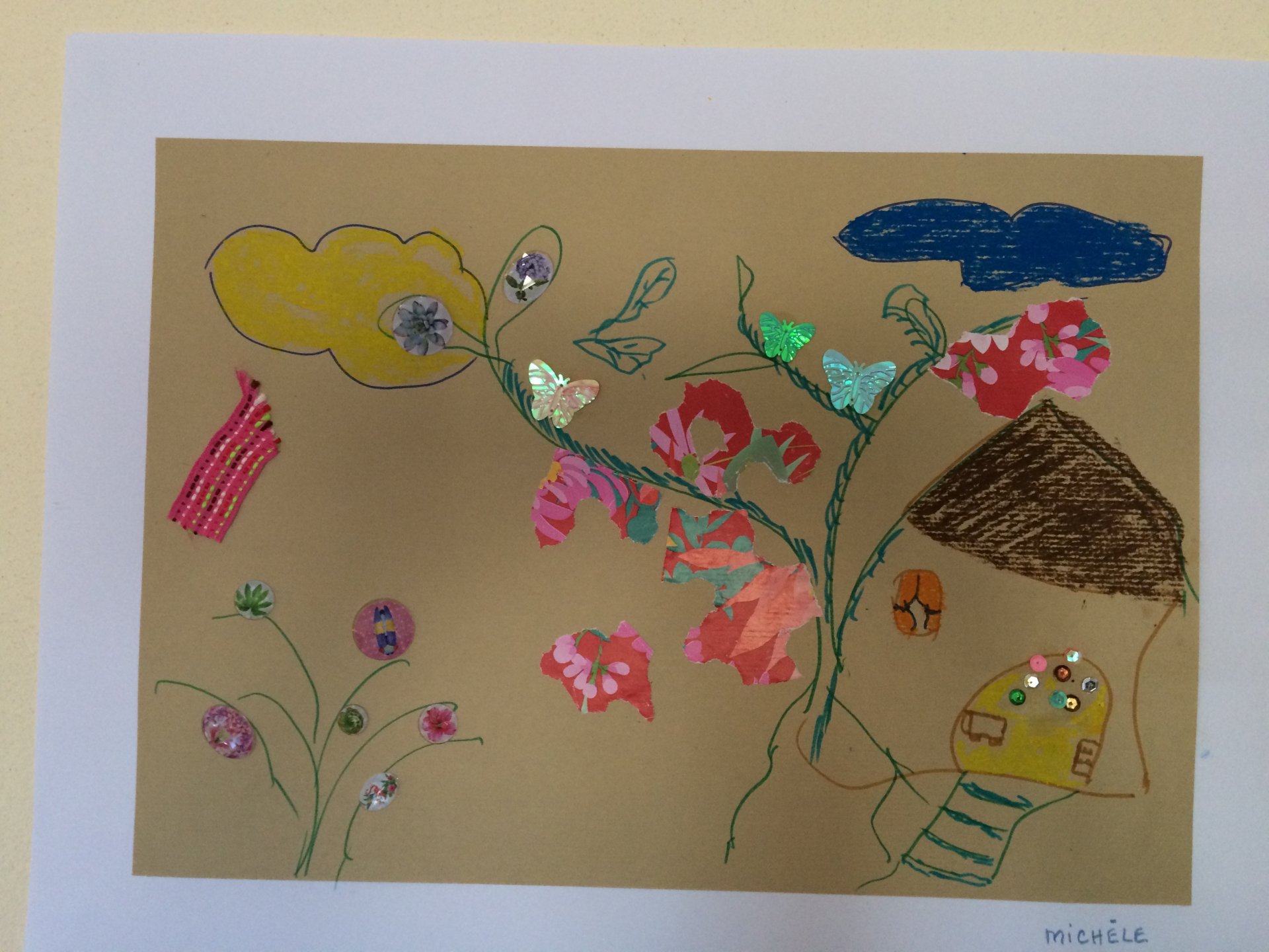 Suite à une goûter partagé , Madame Plume a proposé un atelier dessin et collage à ceux qui le souhaitaient sur le thème des cabanes imaginaires.