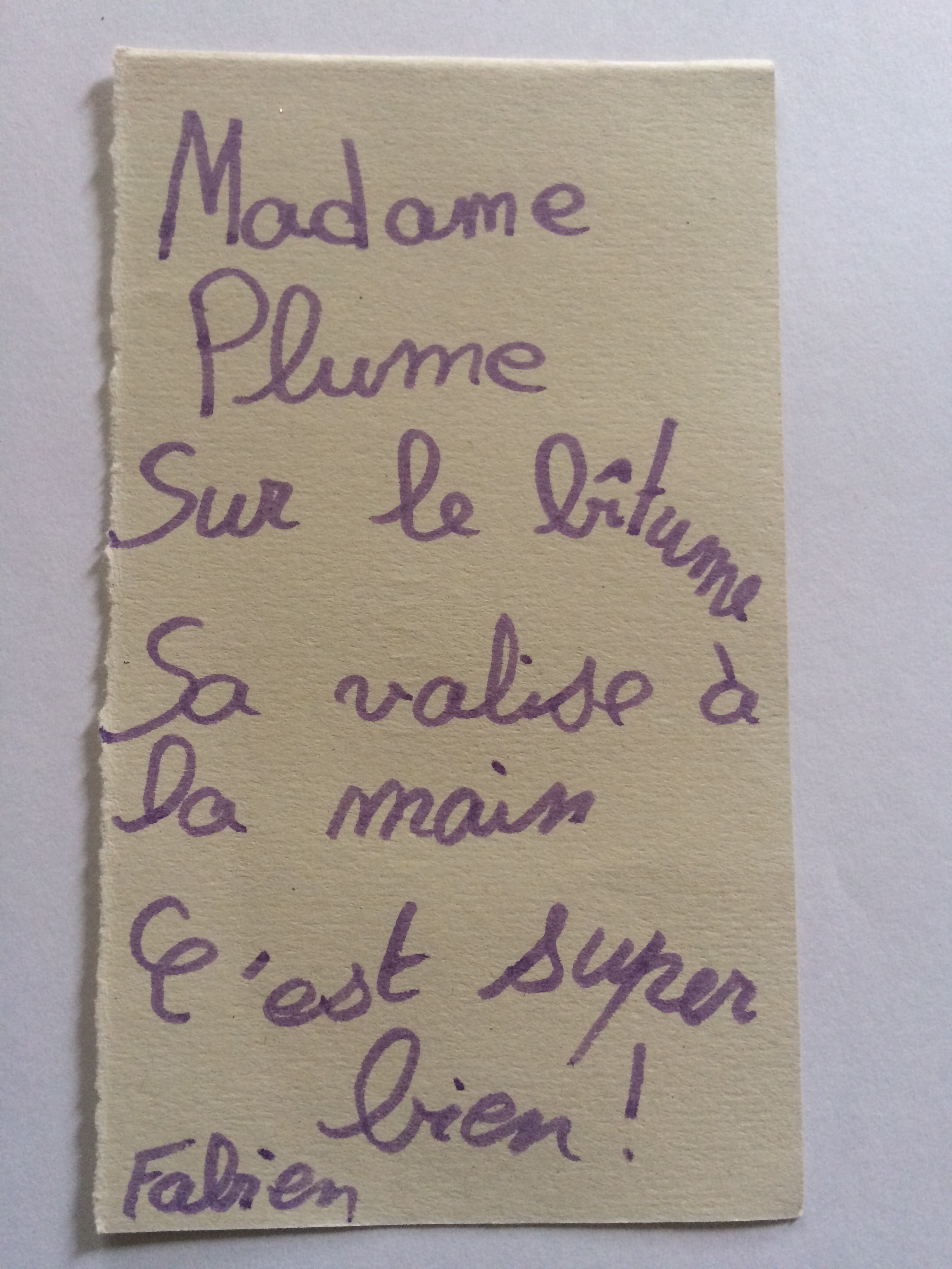 Aujourd’hui, Madame Plume reprend son voyage vers d’autres destinations, vers d’autres groupes d’enfants et d’adultes...Tiens ! Pour le Printemps des Poètes, elle était à la bibliothèque du Lude...Et on dit qu’elle est attendue à la bibliothèque du Grand Lucé en mai et juin !! Sacrée voyageuse !